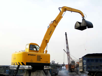 WYS42C-G型電動液壓固定式疊臂抓料機的回轉、卷揚、變幅及抓斗開閉作業(yè)等全部采用電動液壓驅動,先導控制。具有作業(yè)平穩(wěn)、各動作可無級調速;同等作業(yè)效率下可比內燃機驅動節(jié)省60%能耗;司機室安裝冷暖兩用空調、多向調節(jié)座椅,作業(yè)環(huán)境舒適;配裝不同的液壓抓斗后均有自重小、抓取力大,對沙石、煤等散裝原料進行抓取作業(yè)。