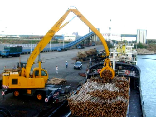 加長二節(jié)臂“雙動力”抓木機(jī)奮戰(zhàn)碼頭卸船一線